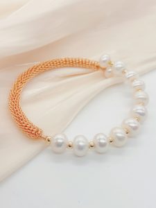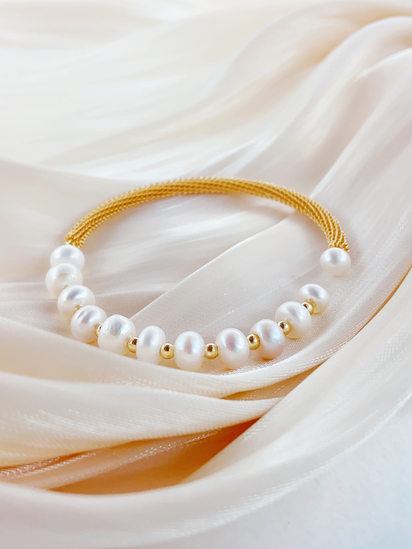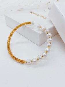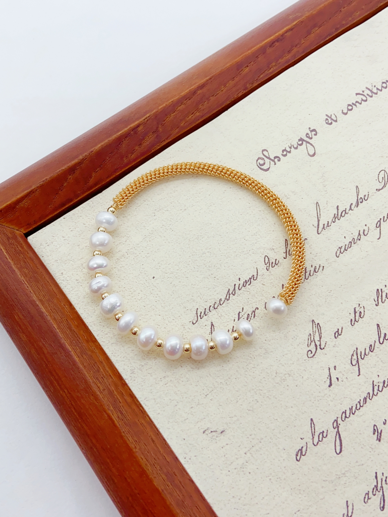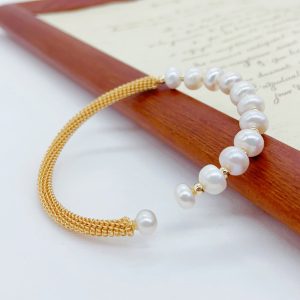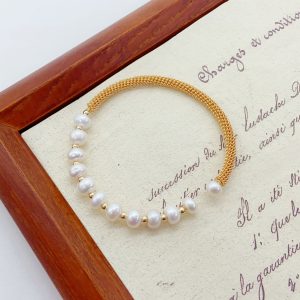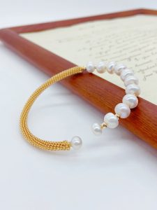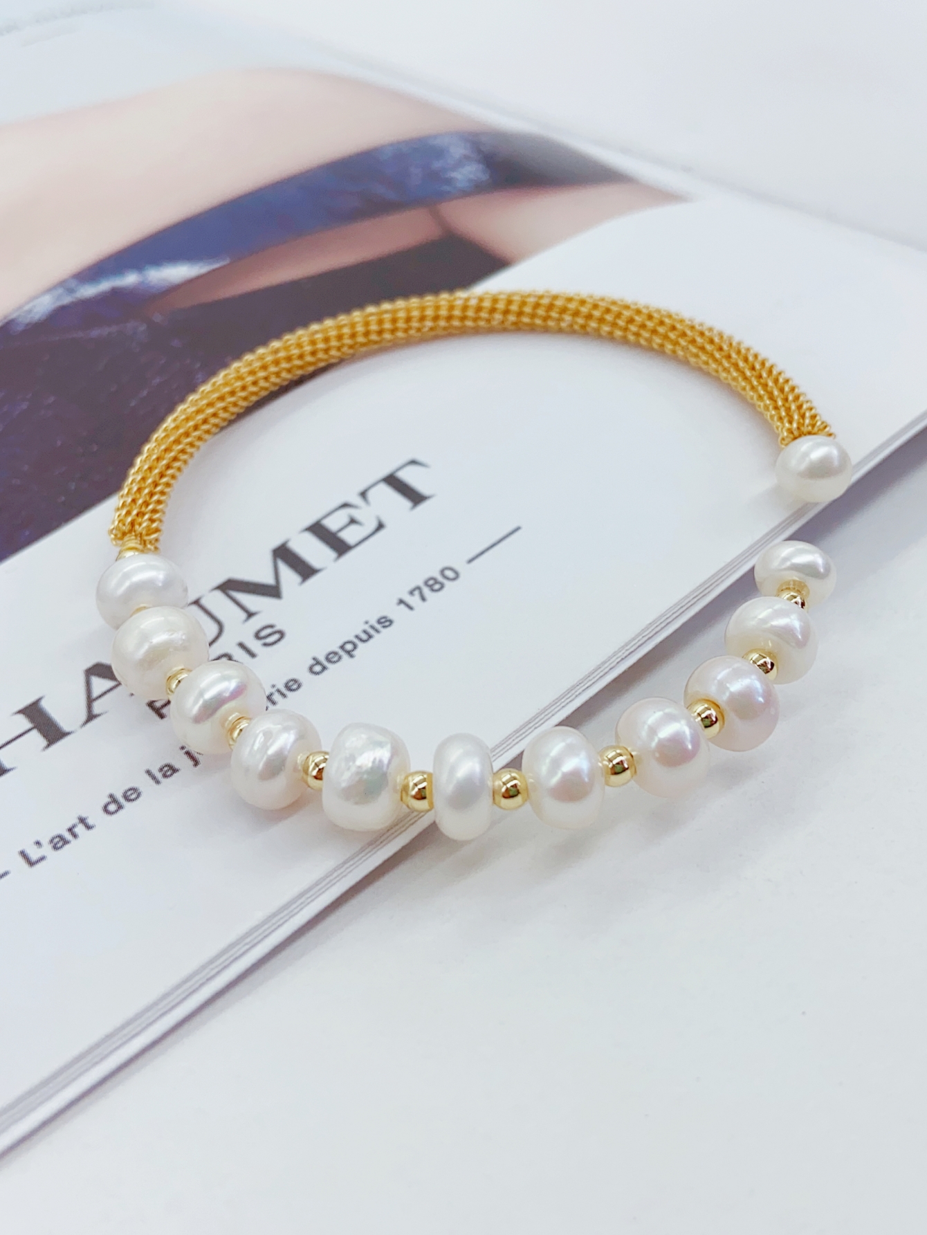 这款手链的设计理念源于优雅与奢华的完美结合。 精心挑选的珍珠与金线的巧妙结合,不仅凸显了珍珠独特的光泽和色泽,更传递出高贵典雅的气息。 金色小球的点缀如星星般闪耀,为手链增添了奢华神秘的魅力。手链的设计注重细节控制,每一颗珍珠都经过精心挑选,确保其形状和光泽的完美呈现。 金线的设计巧妙,蜿蜒曲折的线条不仅展现了精湛的工艺,更凸显了手链的独特个性。 这款手链的设计理念旨在将优雅、奢华、神秘完美融合,为佩戴者创造独特的情感体验,展现佩戴者高贵优雅的气质。