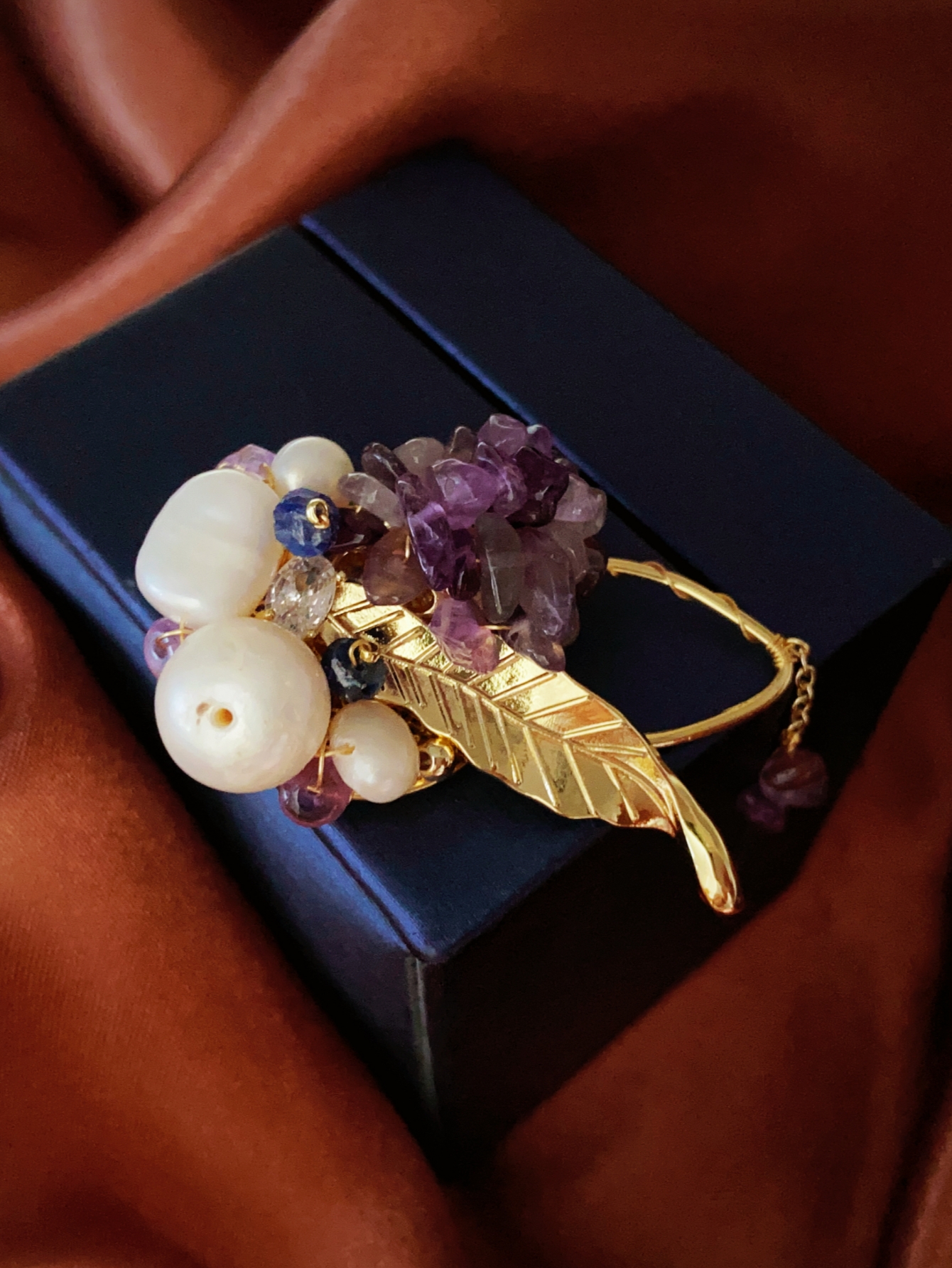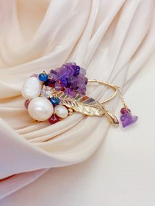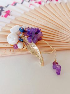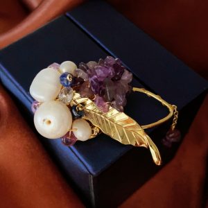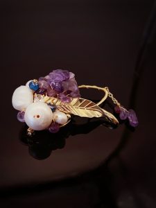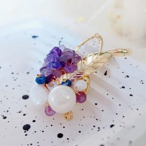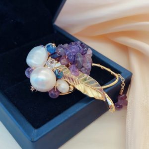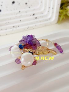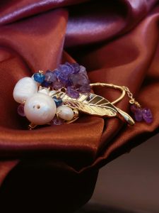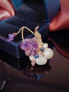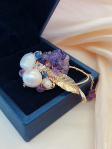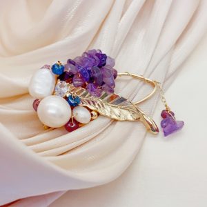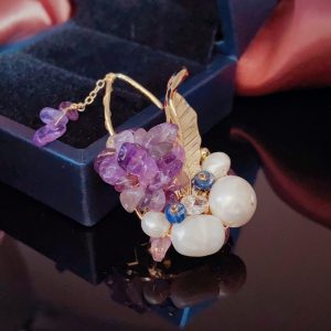 This brooch showcases nobility and elegance with its unique material and design. It is composed of a purple stone and a white pearl, both carefully selected and polished to ensure that their color, texture, and size can perfectly match. The design of the entire brooch is very simple, but without losing any details. It is placed on a soft beige scarf, which has a good texture and gives a comfortable and warm feeling. This design not only highlights the magnificence and delicacy of the brooch, but also fills the entire scene with a feminine atmosphere