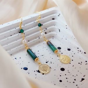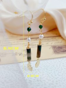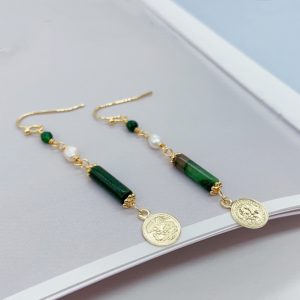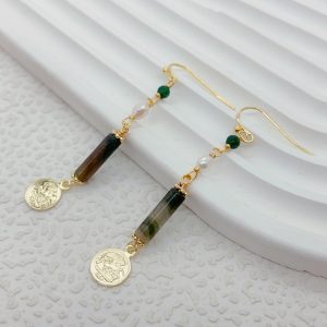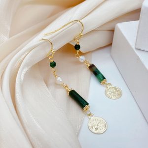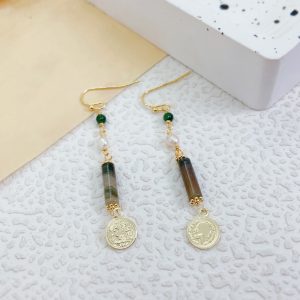 This crystal earring features green chalcedony as the main body, showcasing an elegant and noble atmosphere. The design of the earrings is exquisite and delicate, perfectly combining chalcedony and gold coins through exquisite craftsmanship, highlighting the exquisite craftsmanship of jewelry. The overall design concept emphasizes details and quality, integrating beauty and elegance, making the wearer the focus of the occasion.