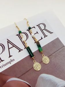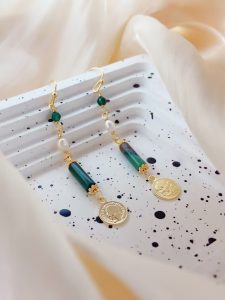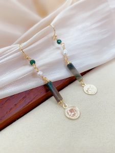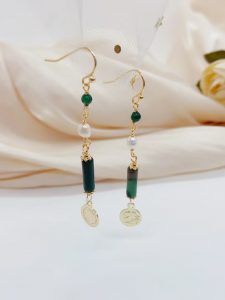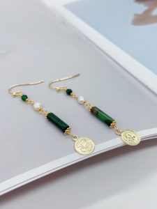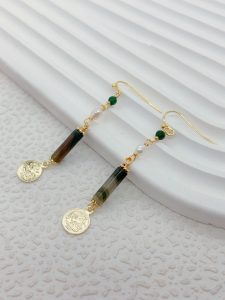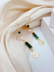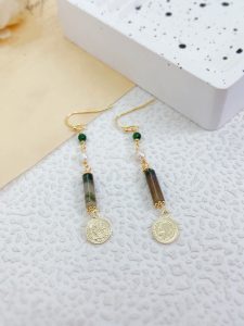 This crystal earring features green chalcedony as the main body, showcasing an elegant and noble atmosphere. The design of the earrings is exquisite and delicate, perfectly combining chalcedony and gold coins through exquisite craftsmanship, highlighting the exquisite craftsmanship of jewelry. The overall design concept emphasizes details and quality, integrating beauty and elegance, making the wearer the focus of the occasion.