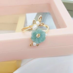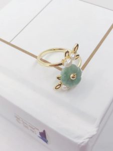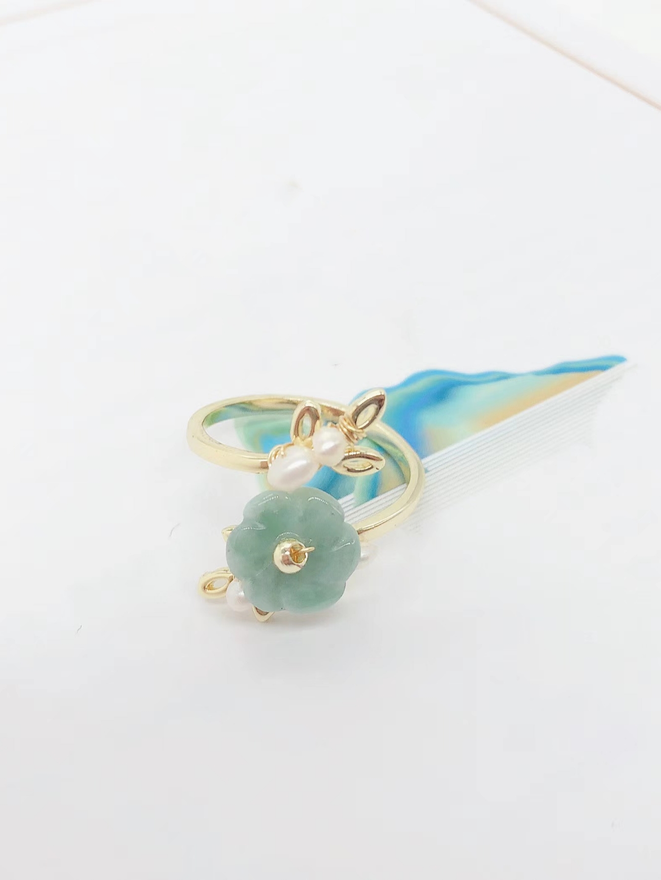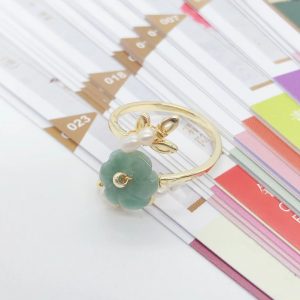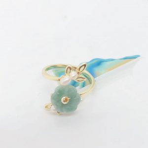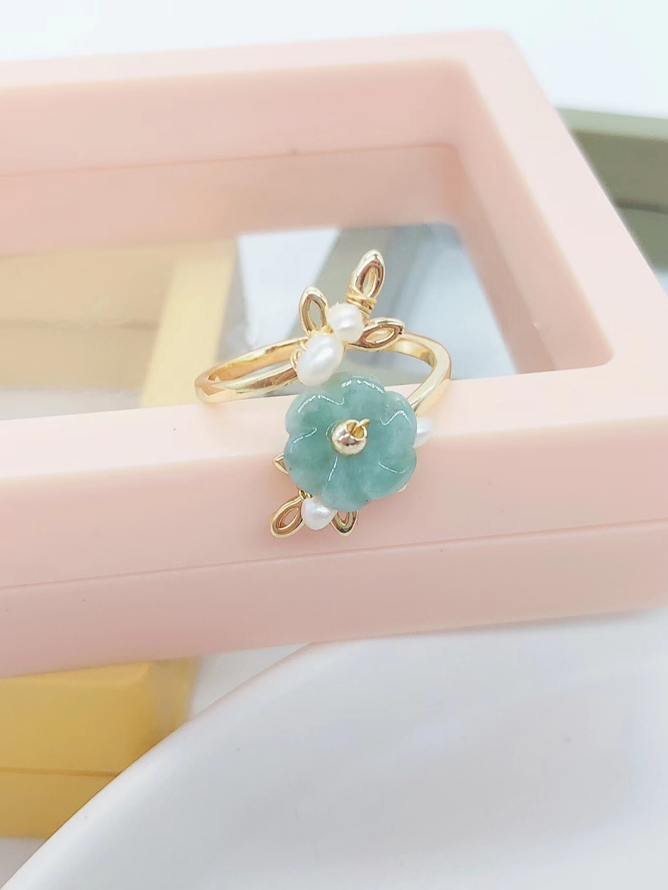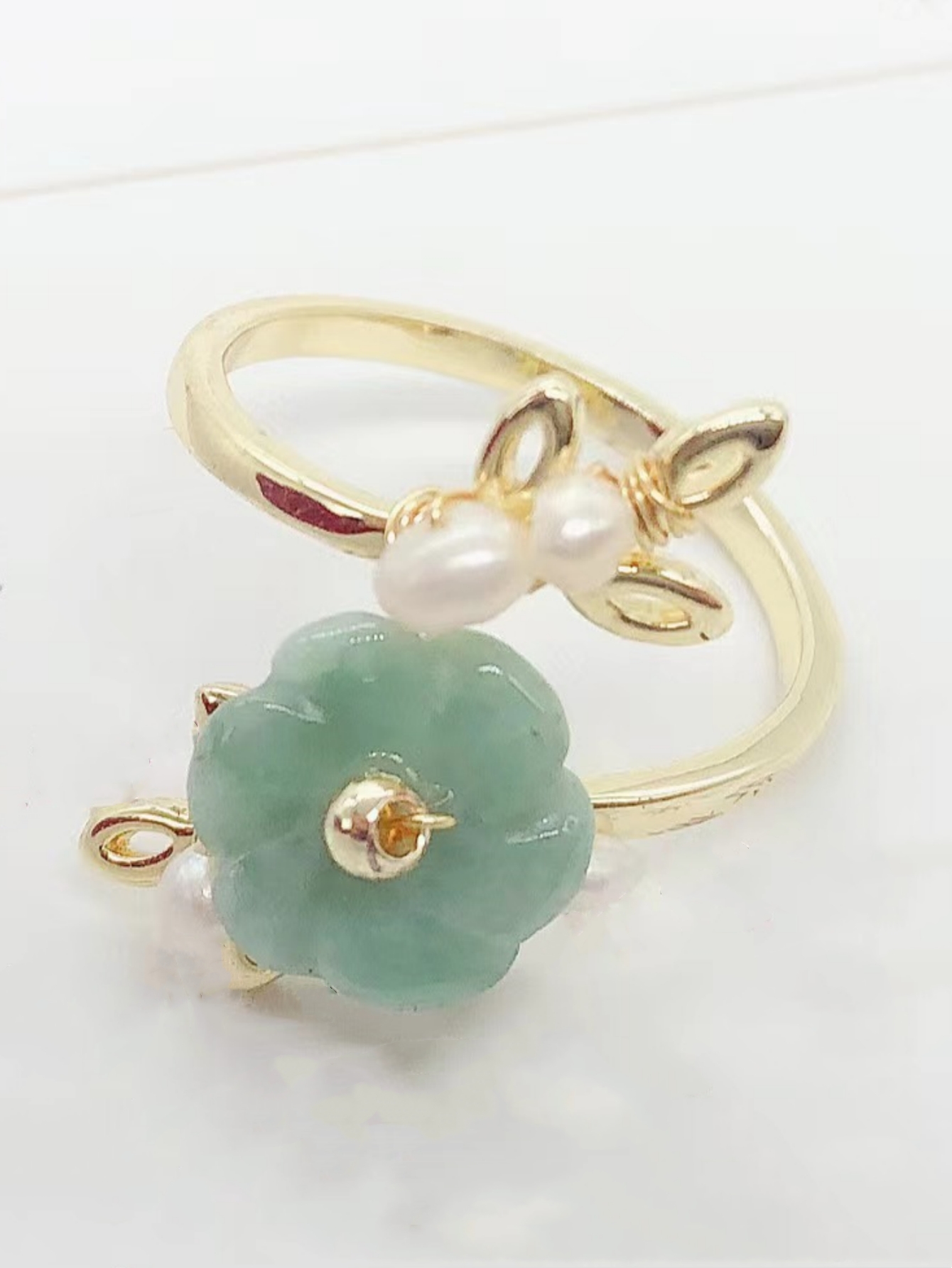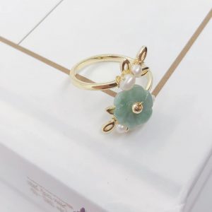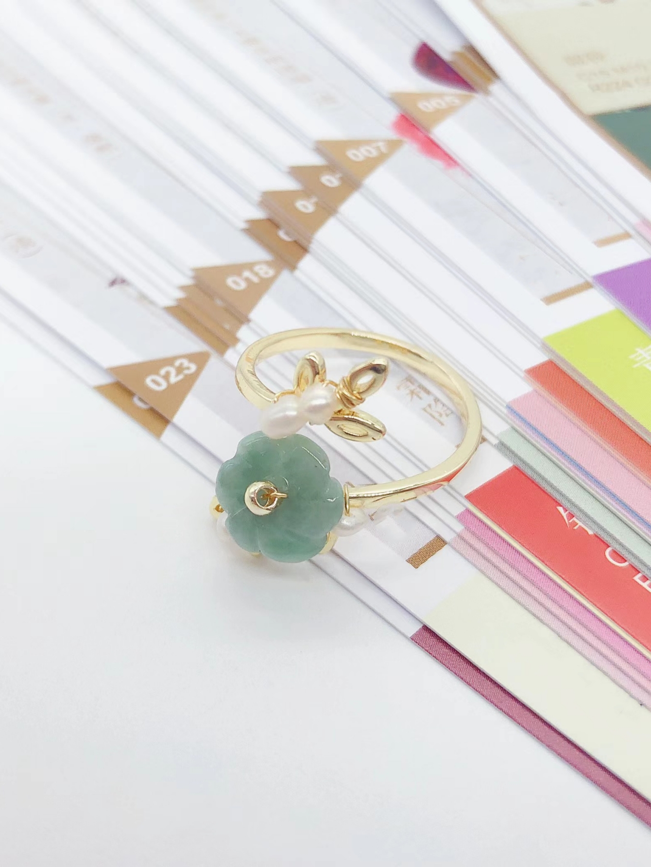 这款金戒指设计独特,工艺精湛,体现了优雅与精致的完美结合。 采用优质镀金材质,经过精细打磨和雕刻,呈现出夺目的光泽和质感。 戒指上的绿宝石和珍珠装饰均精选上乘品质,通过精湛的镶嵌工艺与戒指的造型完美融合,犹如大自然中的宝石,散发出优雅神秘的光芒。 整个设计灵感源自自然元素,将自然魅力与珠宝艺术相结合,展现出独特的视觉效果。