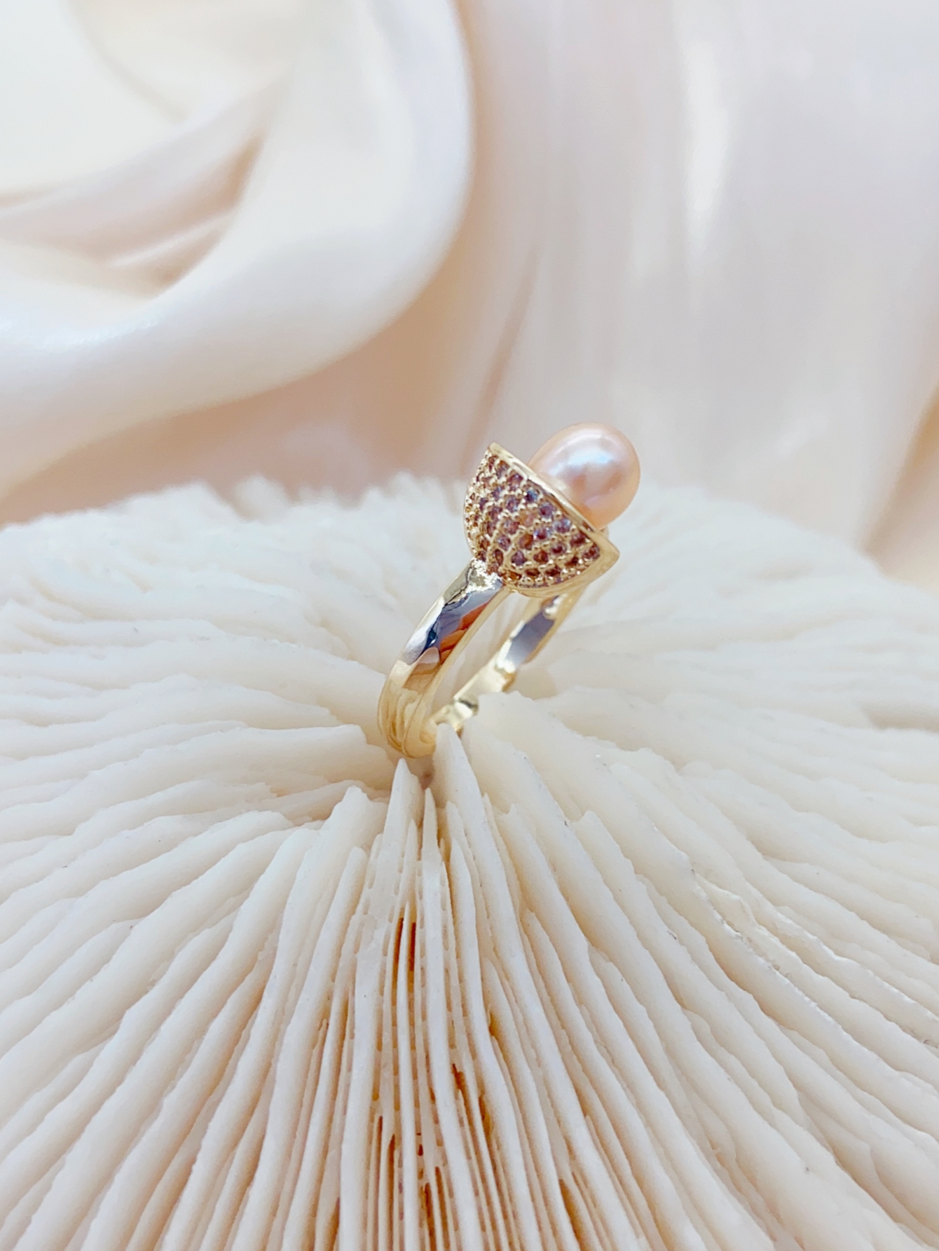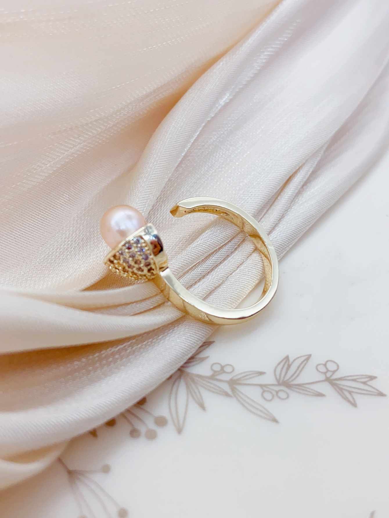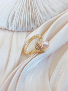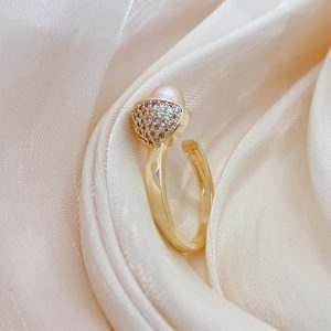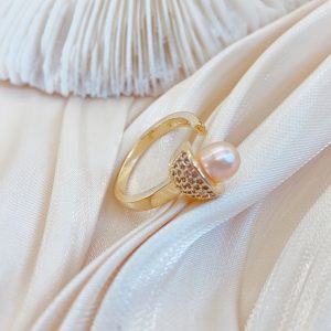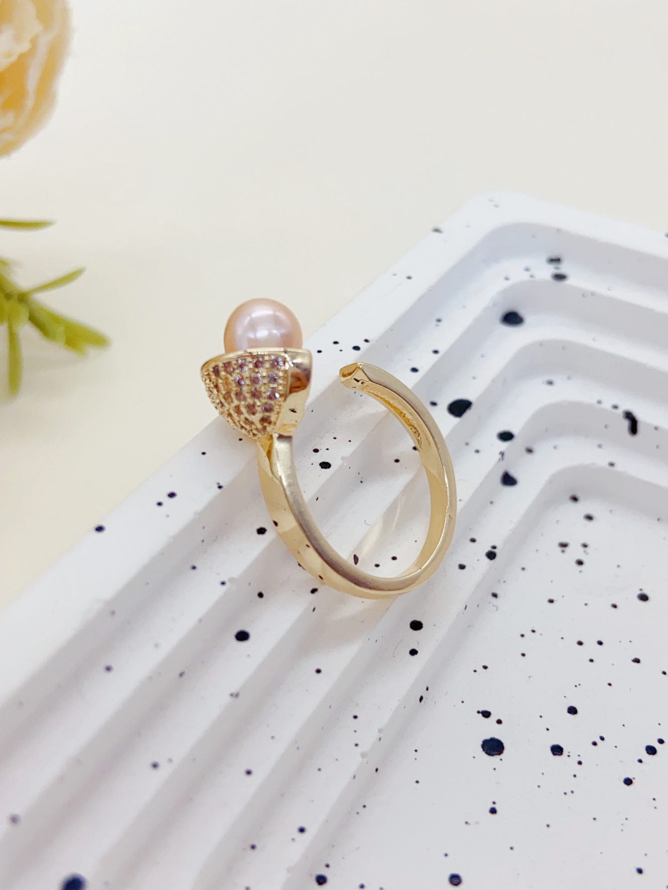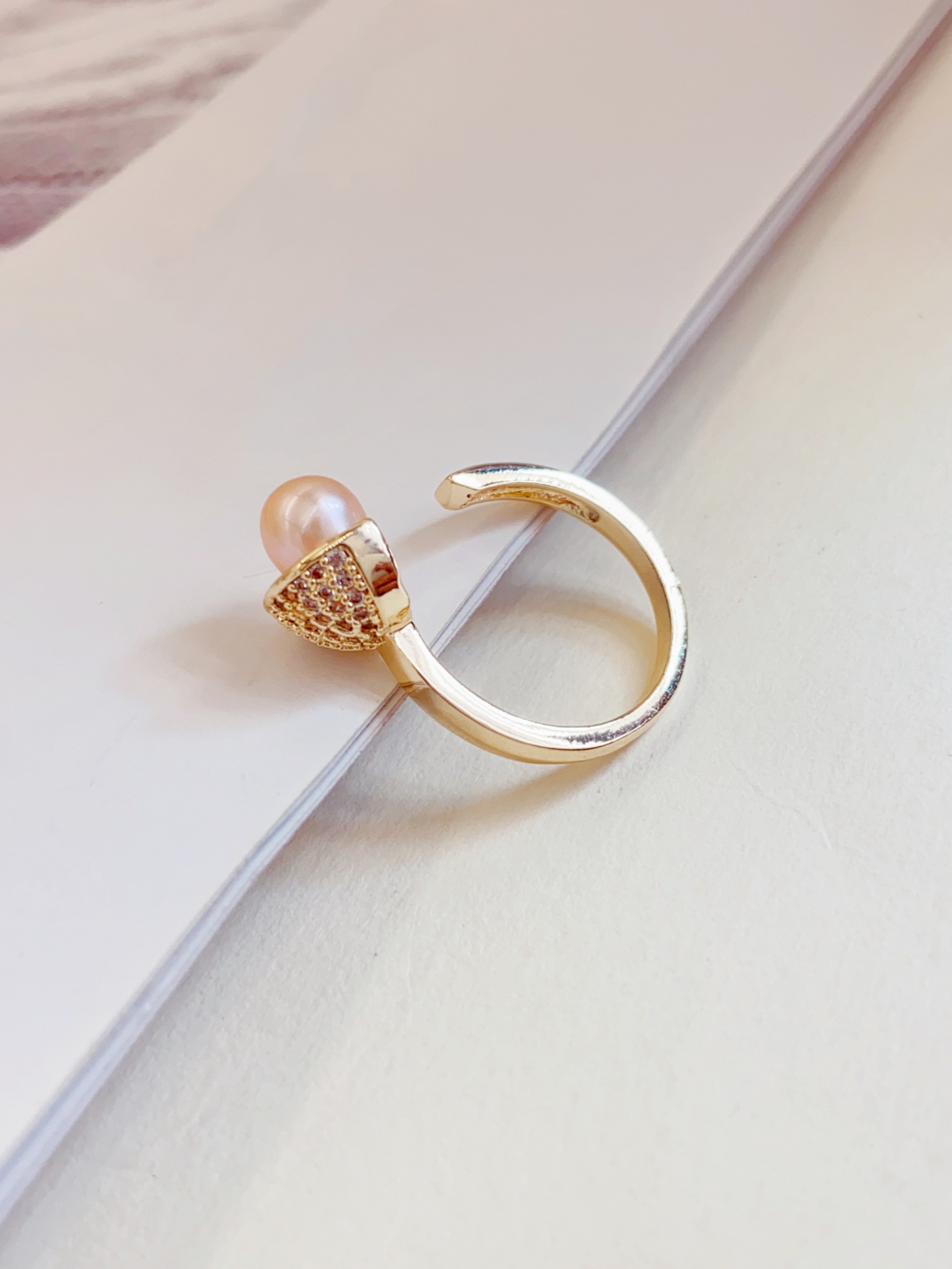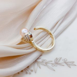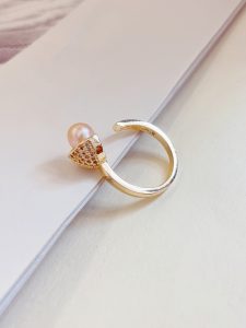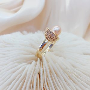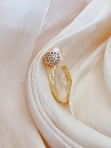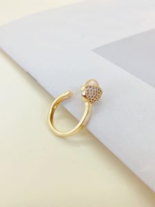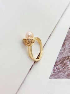 这款金色珍珠锆石戒指以其华丽的金色和精湛的工艺给人留下了深刻的印象。 金戒指采用优质镀金制成,经过精心打磨和雕刻,呈现出绚丽的光泽和细腻的质感。 戒指中镶嵌的珍珠和锆石是这枚戒指的点睛之笔。 珍珠是一种柔和优雅的白色,与镀金形成鲜明对比,为整个设计增添了一抹柔和的感觉。 而锆石则闪闪发光,其纯净的光芒让整个戒指更加引人注目。